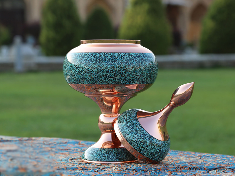 شکلات خوری فیروزه کوب با ارتفاع 30 سانتی متر از بدنه مسی و فیروزه های تزئینی زیبا ساخته شده است. این محصول که از ارزنده ترین صنایع دستی محسوب می شود، به دست هنرمندان بزرگ این مرز و بوم ایجاد شده است. آنچه این شکلات خوری مس و فیروزه را مهم نشان داده است، ظرافت بالا در طراحی است.